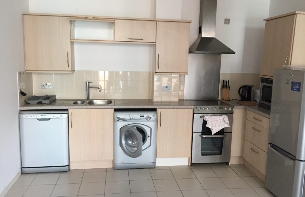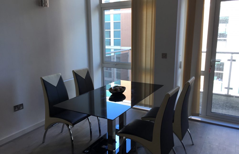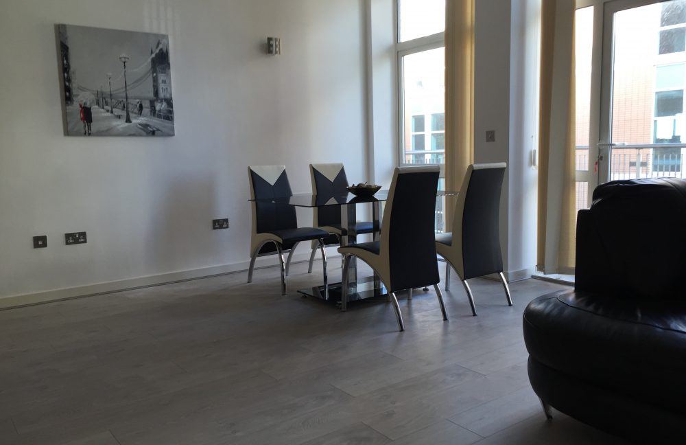 The property includes laminated flooring throughout. It is fully furnished (including all the kitchen appliances and crockery/utensils) and decorated to a high standard including glass dinning table with upholstered chairs, leather sofa and upholstered bed.