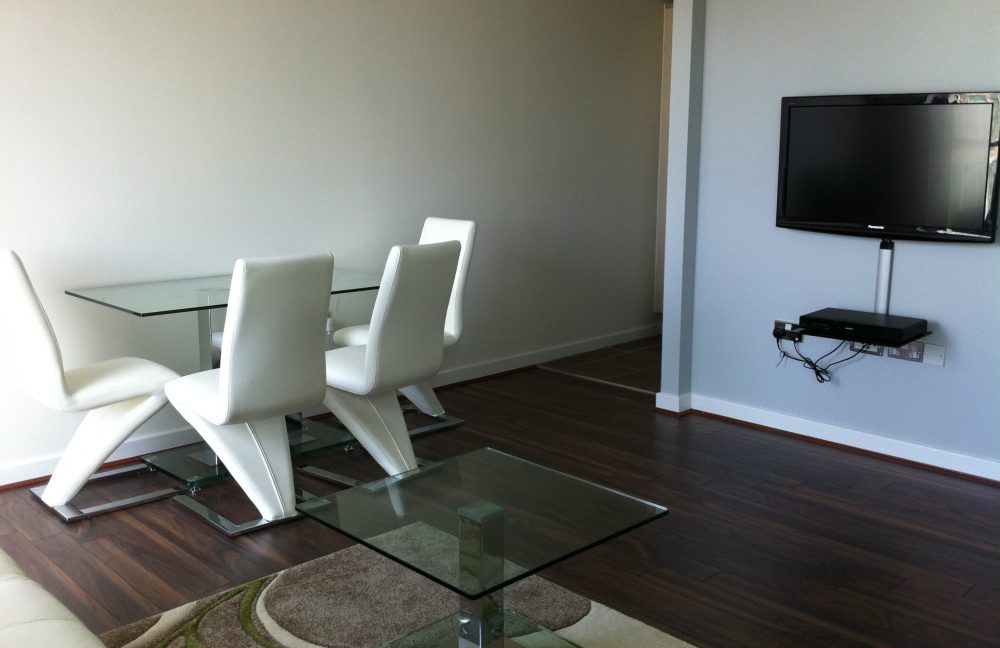 Living room: Italian designer furniture, including glass table, coffee table, upholstered chairs in white leather and white leather sofa. Flat screen TV, blue ray DVD player and hi fi system.